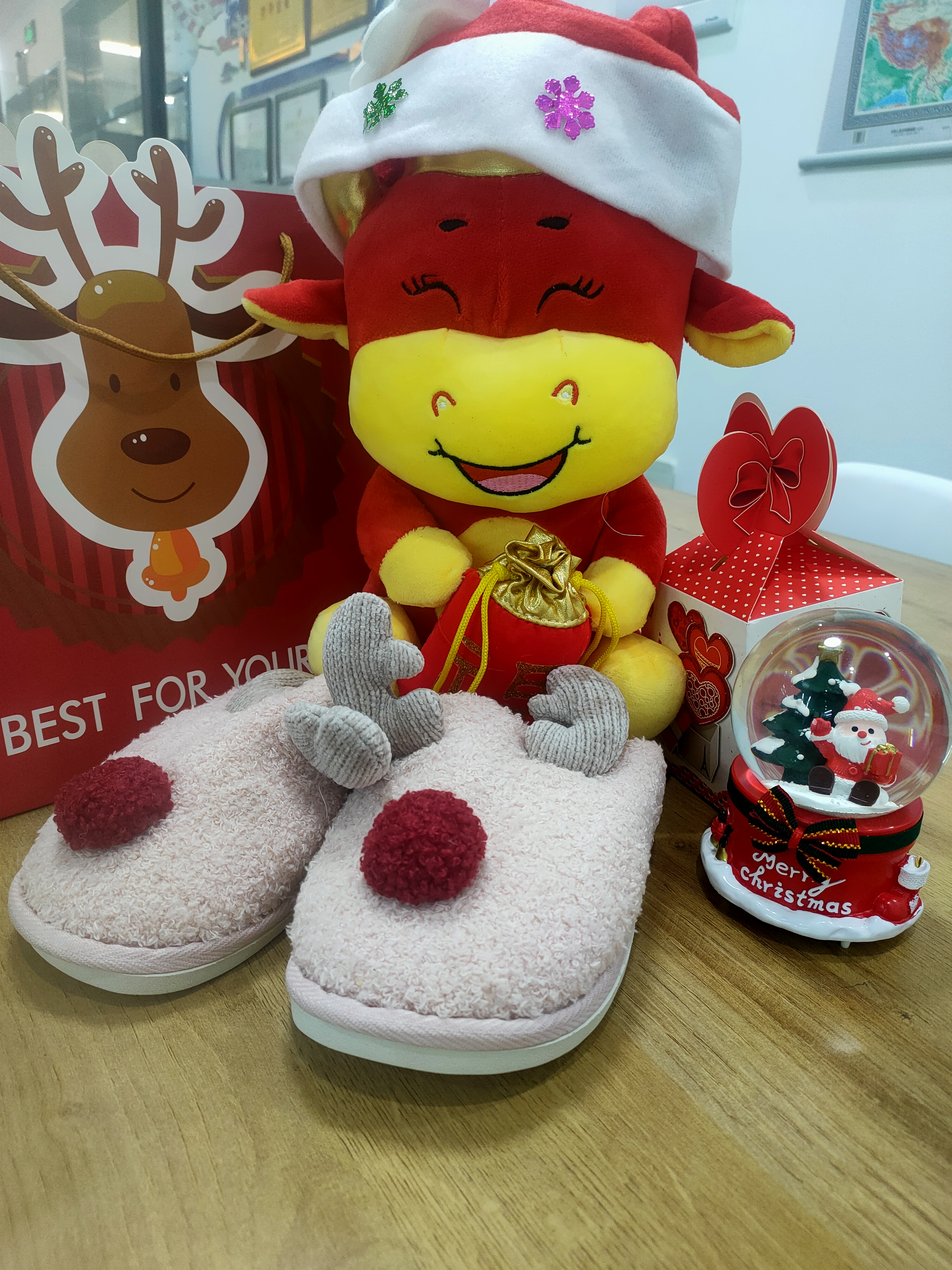 今年除了必备的“平安果”,还搭配了一双圣诞风格的毛绒家居拖鞋,希望给大家在寒冷的冬天送上一份家的温暖,也祝愿大家穿上新拖鞋走更加幸福舒适的路。